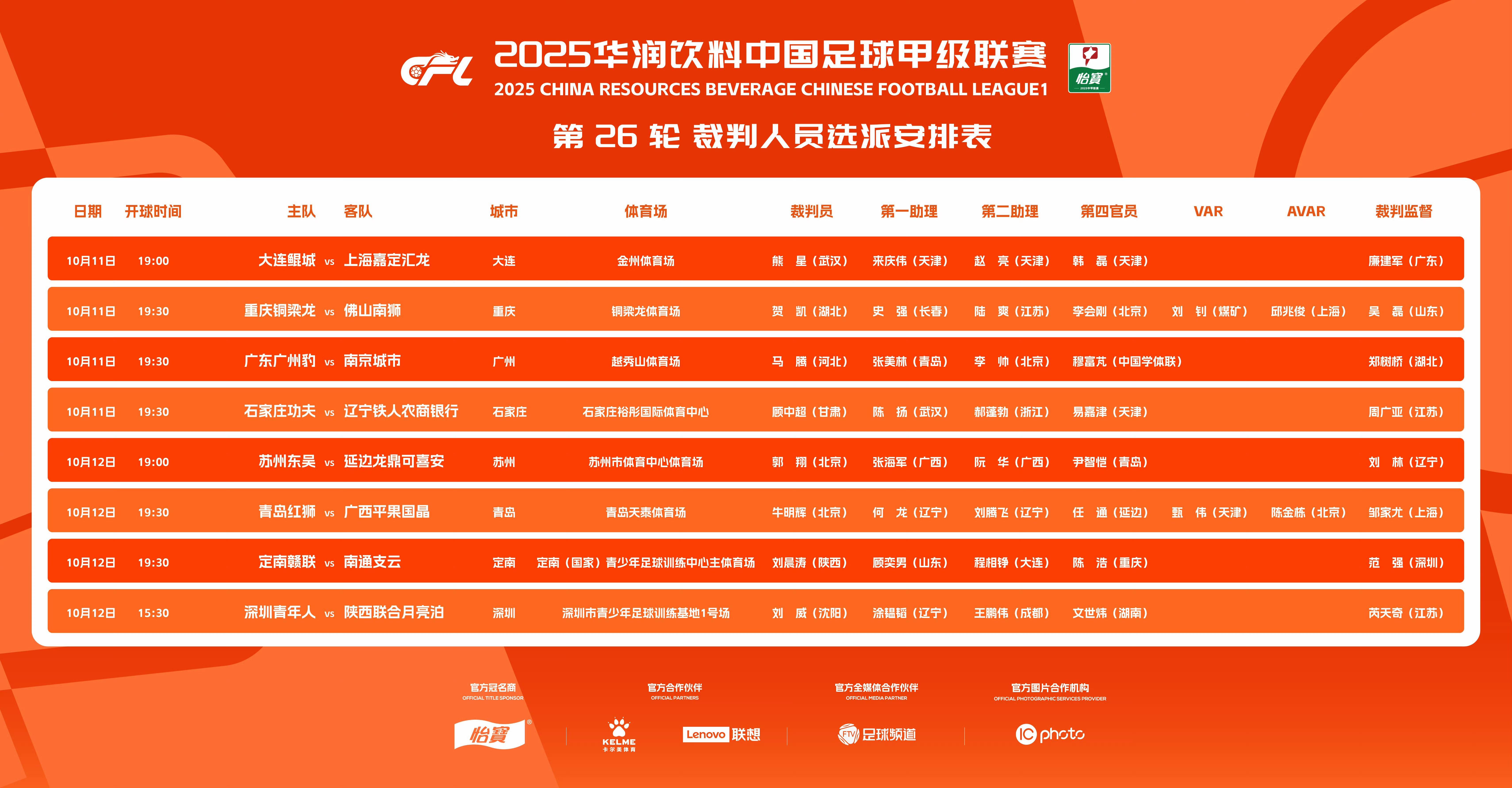 北京时间10月11日,中甲第26轮裁判名单公布,重庆铜梁龙vs佛山南狮、青岛红狮vs广西平果启用VAR。